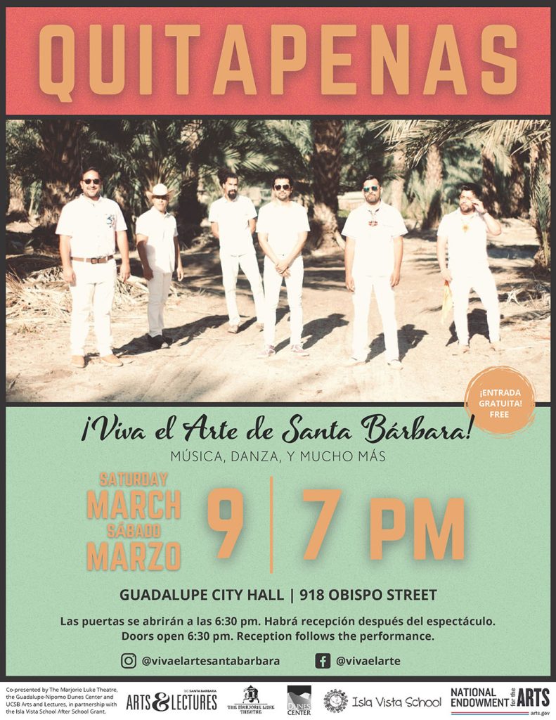FREE Viva el Arte de Santa Barbara – Quitapenas – Saturday, March 9, 7pm Post author:Guadalupe Coalition of Nonprofits Admin Post published:February 27, 2024 Post category:Announcements On Saturday, March 9, at 7pm join us at Guadalupe City Hall for a FREE Viva el Arte de Santa Barbara performance featuring Quitapenas You Might Also Like Non-Partisan SB County Supervisor Candidate Forums – Thursday, Feb 1, 2024 January 26, 2024 2nd Guadalupe Clean Air Fair at Leroy Park – May 18th May 6, 2024 Dunes Center Gala – July 27th, 2024 July 11, 2024
